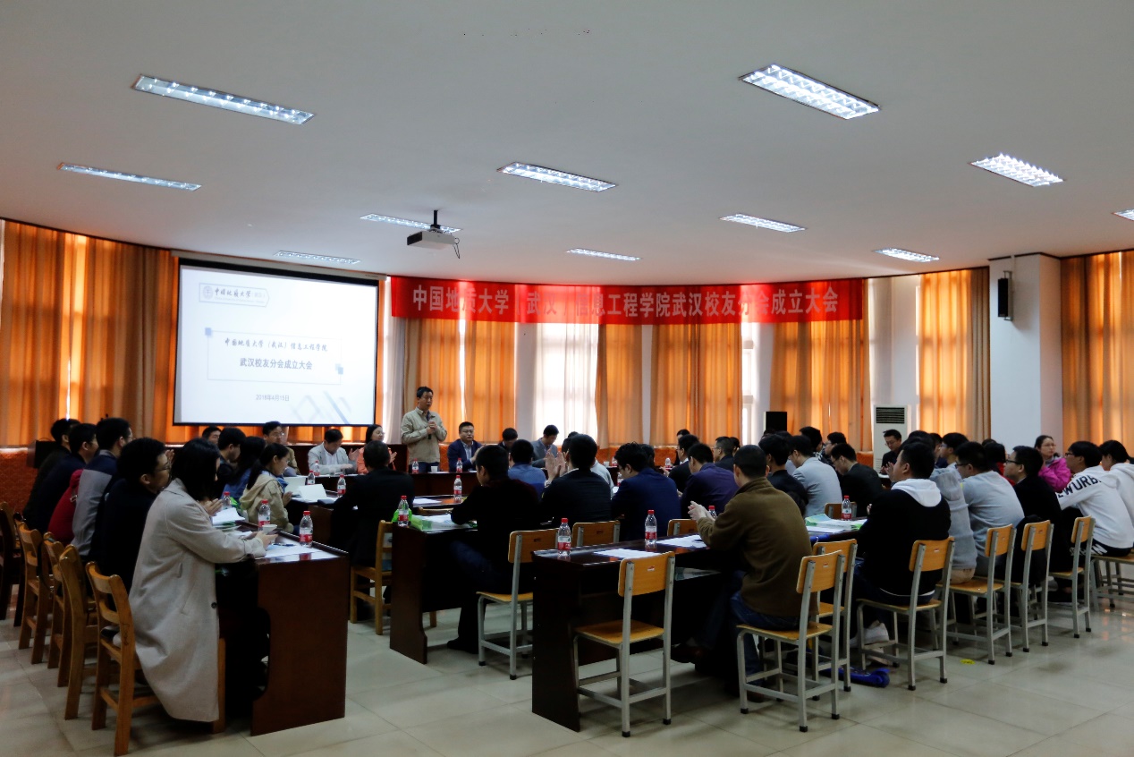 2018年4月15日上午,中国地质大学(武汉)信息工程学院武汉校友分会成立大会在学校东苑会议室隆重举行。中国地质大学(武汉)校友与社会合作处处长徐岩,信息工程学院党委书记黄菊、信息工程学院院长谢忠、副院长刘修国、潘雄、软件工程系主任尚建嘎、地理信息科学系主任胡楚丽、遥感科学与技术系刘福江、学院办公室主任逄礴、学工组全体老师及武汉校友50余人出席成立大会。大会由信息工程学院党委副书记许德华主持。