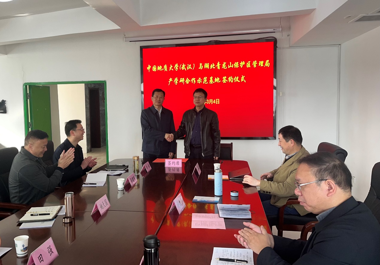 2023年3月4日,学院党委书记许德华一行赴湖北青龙山恐龙蛋化石群国家级自然保护区管理局对接调研,在十堰签署产学研合作示范基地建设协议。青龙山国家级保护区管理局局长姚天国、副局长梁建明、副局长田强、总工程师李敏以及地质公园负责人等出席签约仪式;学院副院长王伦澈、测绘遥感系党支部书记刘福江、学科与社会合作办主任曾杰等陪同对接调研。