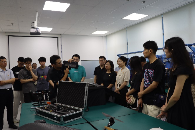 华测公司销售总监杨雅鹏带领师生依次参观了产品展区,精密仪器生产车间及无人机实训室等。展示项目包括航测系统装置、多平台激光雷达、主流测绘无人机等高精度定位科技产品。