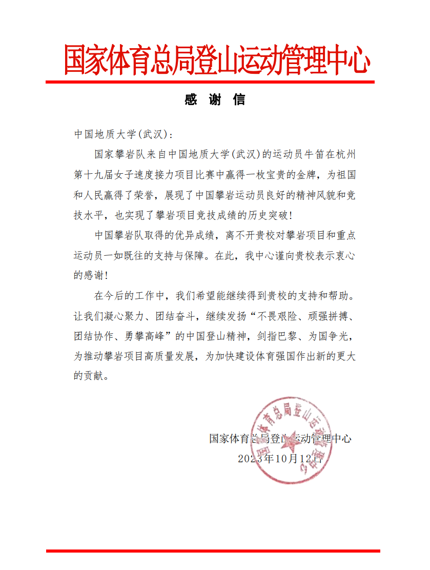 在校期间,牛笛是一名刻苦认真、成熟稳重的学生,心中一直有着坚定的梦想,除了攀岩训练和比赛表现出的勇毅,对学习科研也始终保持着执着与担当,有着不怕挫折、勇于自我突破、不断向上的攀登精神。近日,国家体育总局登山运动管理中心也向对牛笛在杭州亚运会攀岩女子团体速度接力赛决赛中获得冠军发来感谢信。