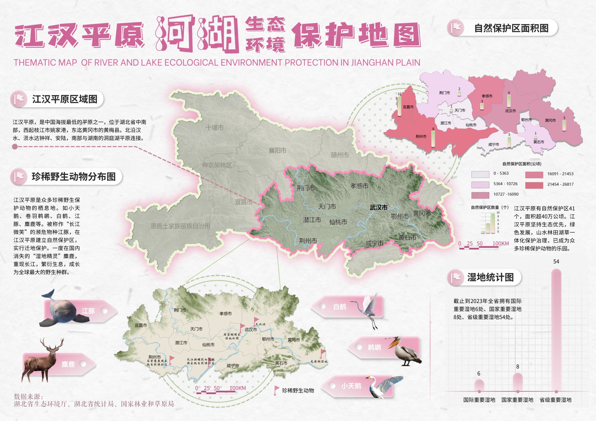 提交的作品为《江汉平原河湖生态环境保护地图》,该系列地图(见下图)贯彻习总书记“山水林田湖草沙”一体化保护修复思想,辅以珍稀动物、空气质量等内容,从多个角度呈现江汉平原河湖生态环境保护状况。