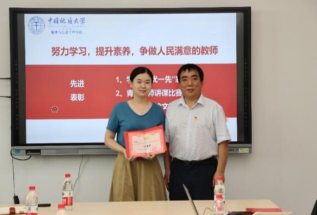 会议首先进行2022年春季学期表彰仪式。副校长赖旭龙教授为在学院青年教师讲课比赛中取得优异成绩的青年教师颁发荣誉证书。院党委书记许德华对学院“两优一先”代表颁发荣誉证书。副院长宋小青教授为学院优秀学位论文指导老师颁发荣誉证书。