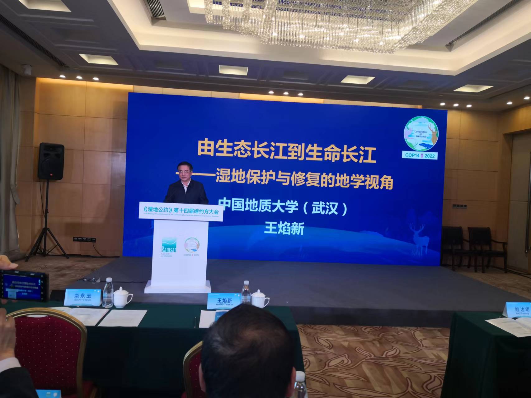 校长王焰新院士做特邀报告,报告中强调:长江大保护有两个关键的思想,一是山水林田湖草沙生命共同体,就是长江生态系统需要一体化的保护与修复,整体保护、系统修复、综合治理,才能有成效;二是基于自然的生态环境修复,长江生态系统的保护与修复工程要逐步转化到基于自然的生态环境修复,减少人类活动对生态系统的干扰,为长江流域经济带高质量发展提供更有韧性的生态系统服务。