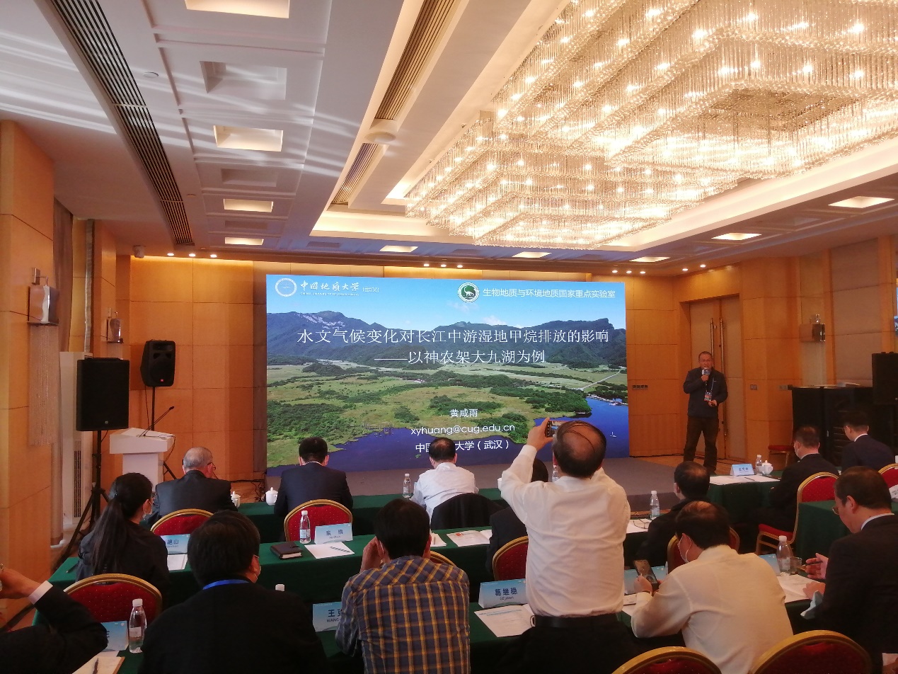 黄咸雨教授作《水文气候变化对长江中游湿地甲烷排放的影响-以神农架大九湖为例》的报告,介绍了湿地研究团队自2014年以来长期观测的大九湖湿地水位、溶解有机碳和甲烷气体排放季节变化规律,发现甲烷气体排放对水位变化的响应规律,并探讨了微生物调控机制。