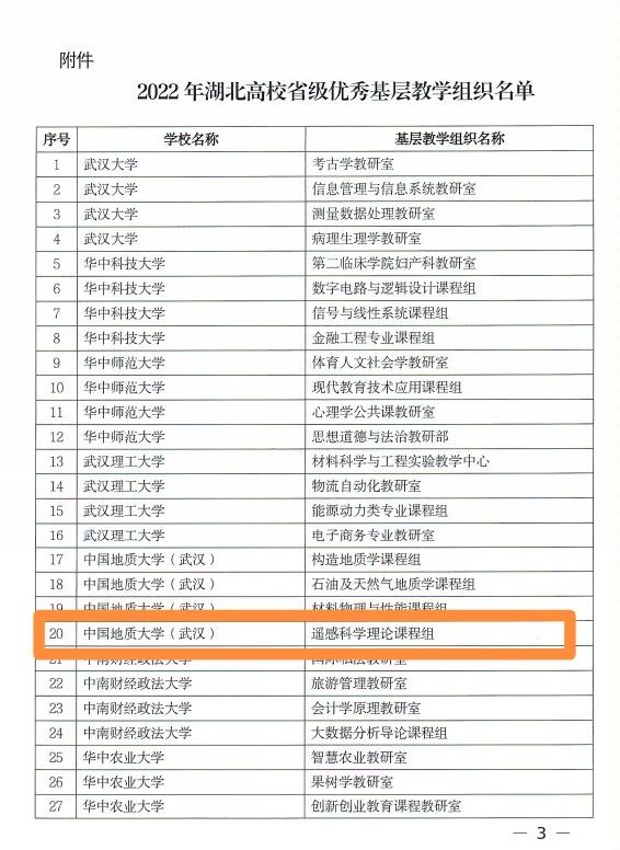 “遥感科学理论课程组”教学团队获得“2022年湖北高校省级优秀基层教学组织”荣誉。