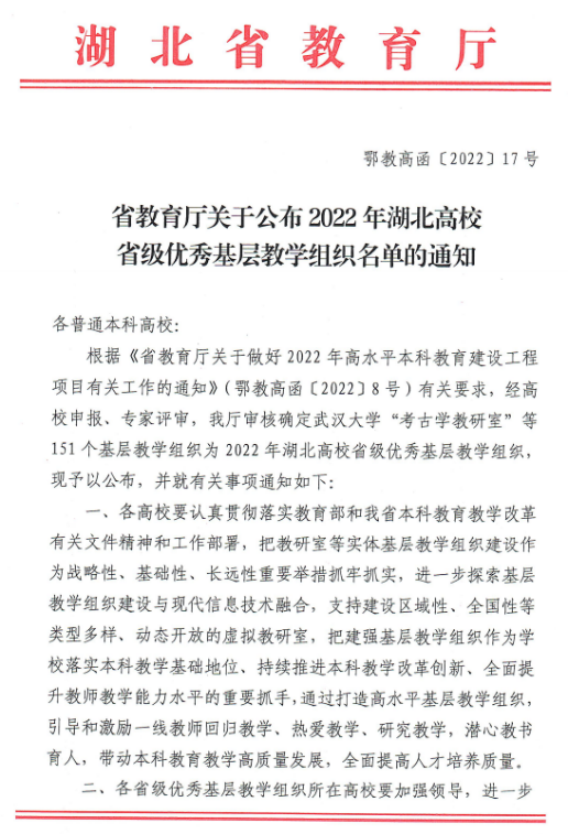 据《省教育厅关于公布2022年湖北高校省级优秀基层教学组织名单的通知》(鄂教高函【2022】17号),电影网站