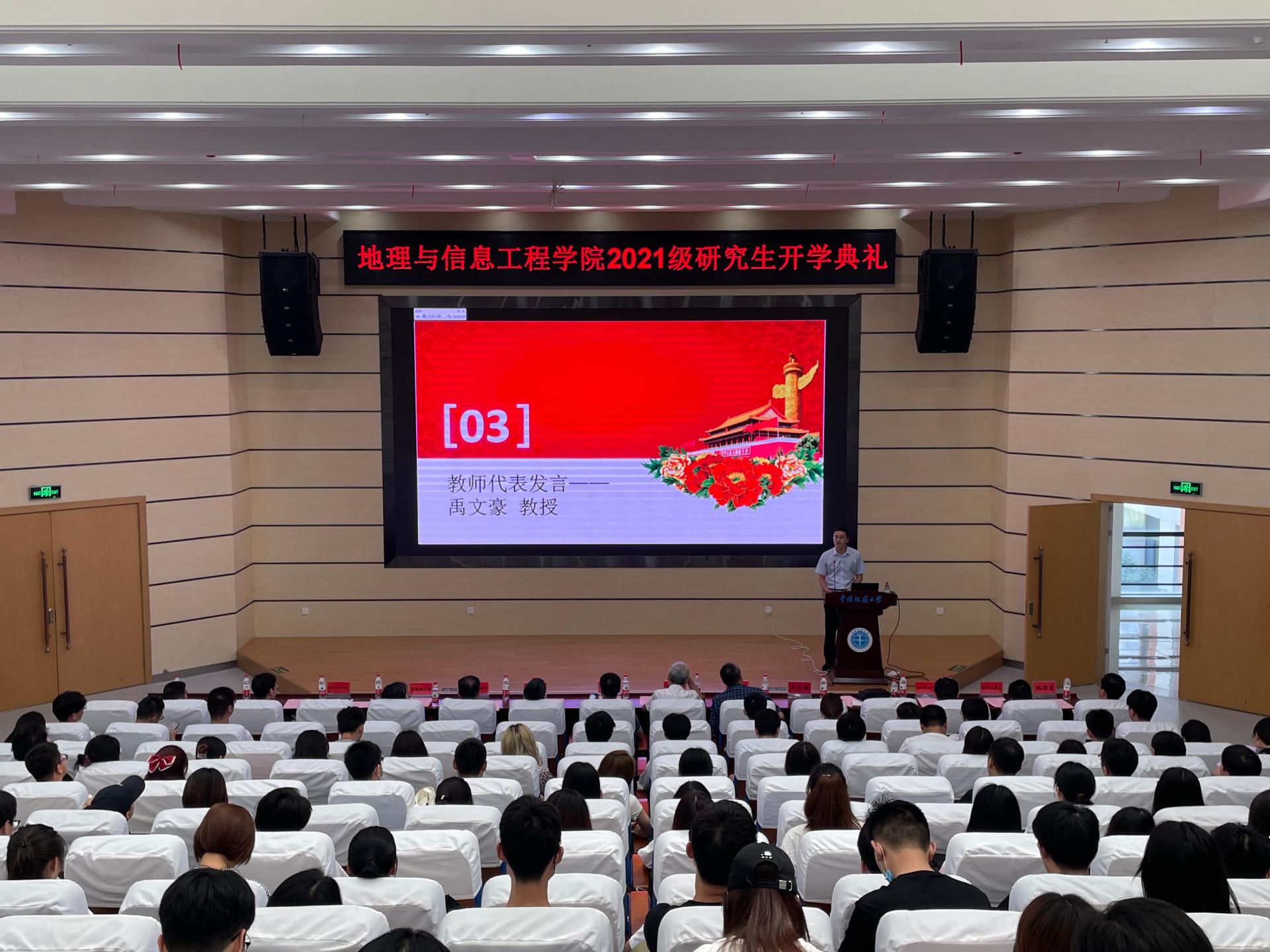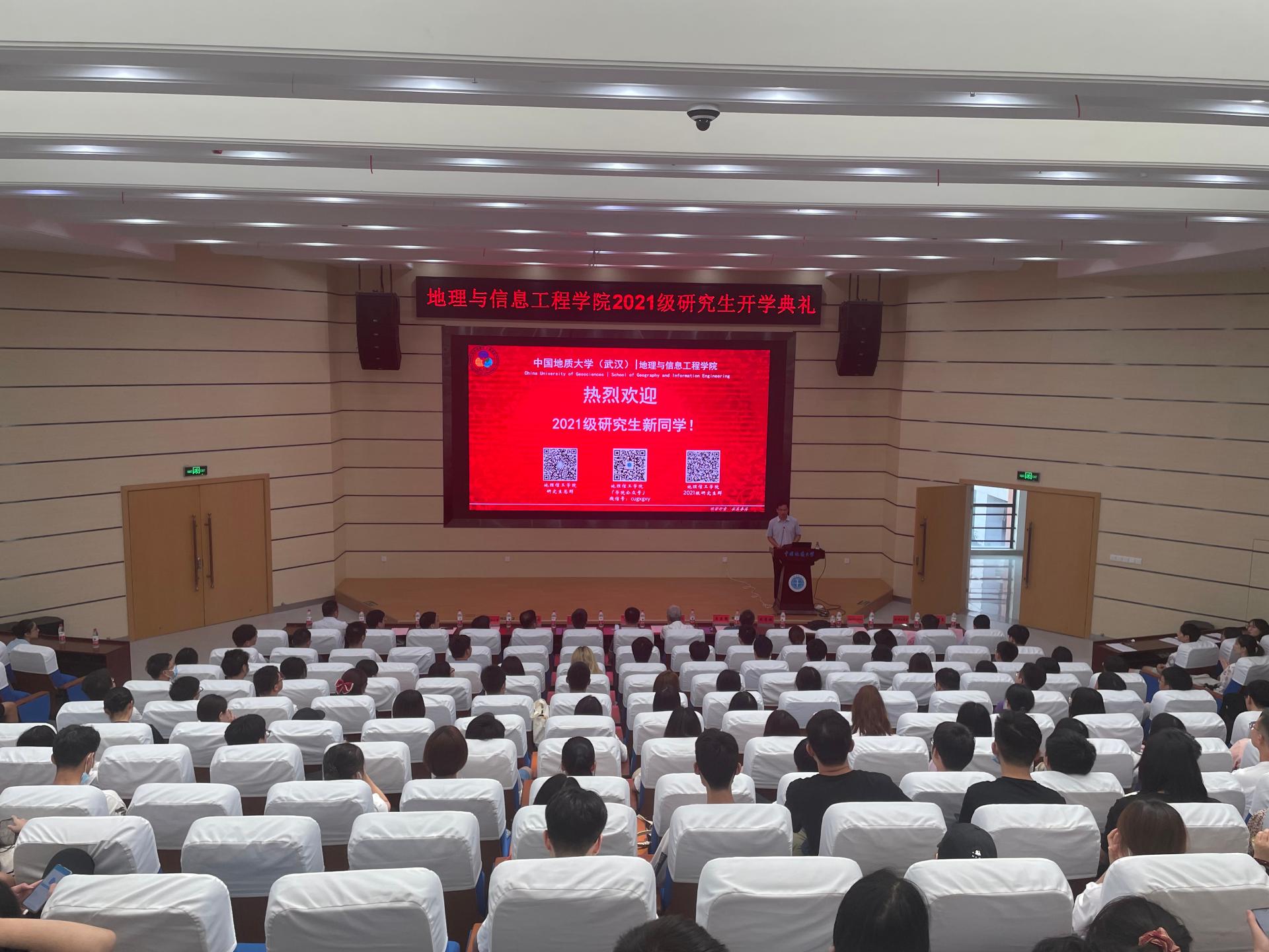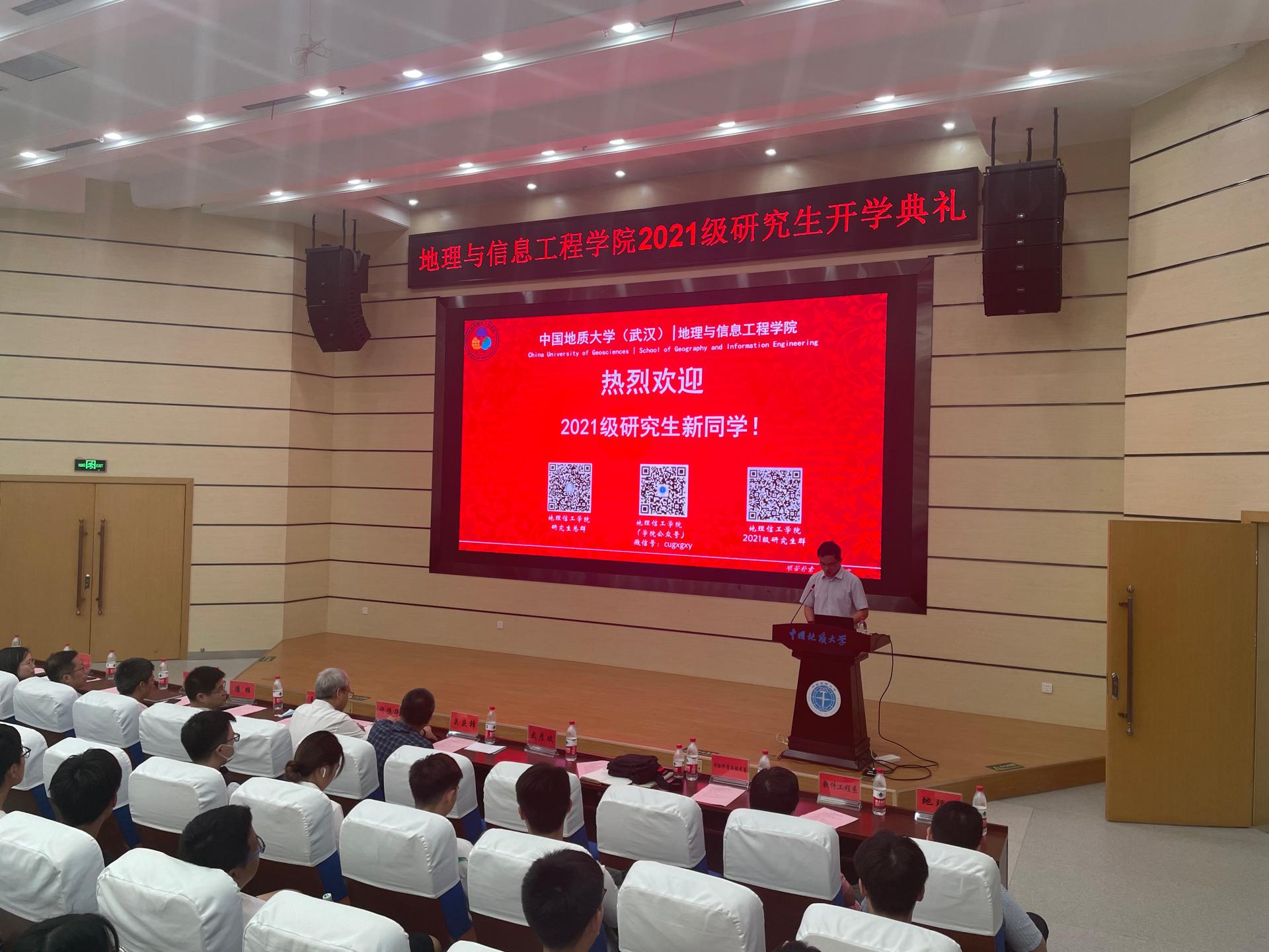 2021级研究生新生开学典礼于在未来城校区公教一楼208报告厅举行。院党委书记许德华、院长王绍强、副院长关庆锋、院党委副书记武彦斌、学院各系主任、教师代表禹文豪、学院办公室、教学与发展办公室、学生工作办公室老师以及2021级全体硕博新生参加典礼。