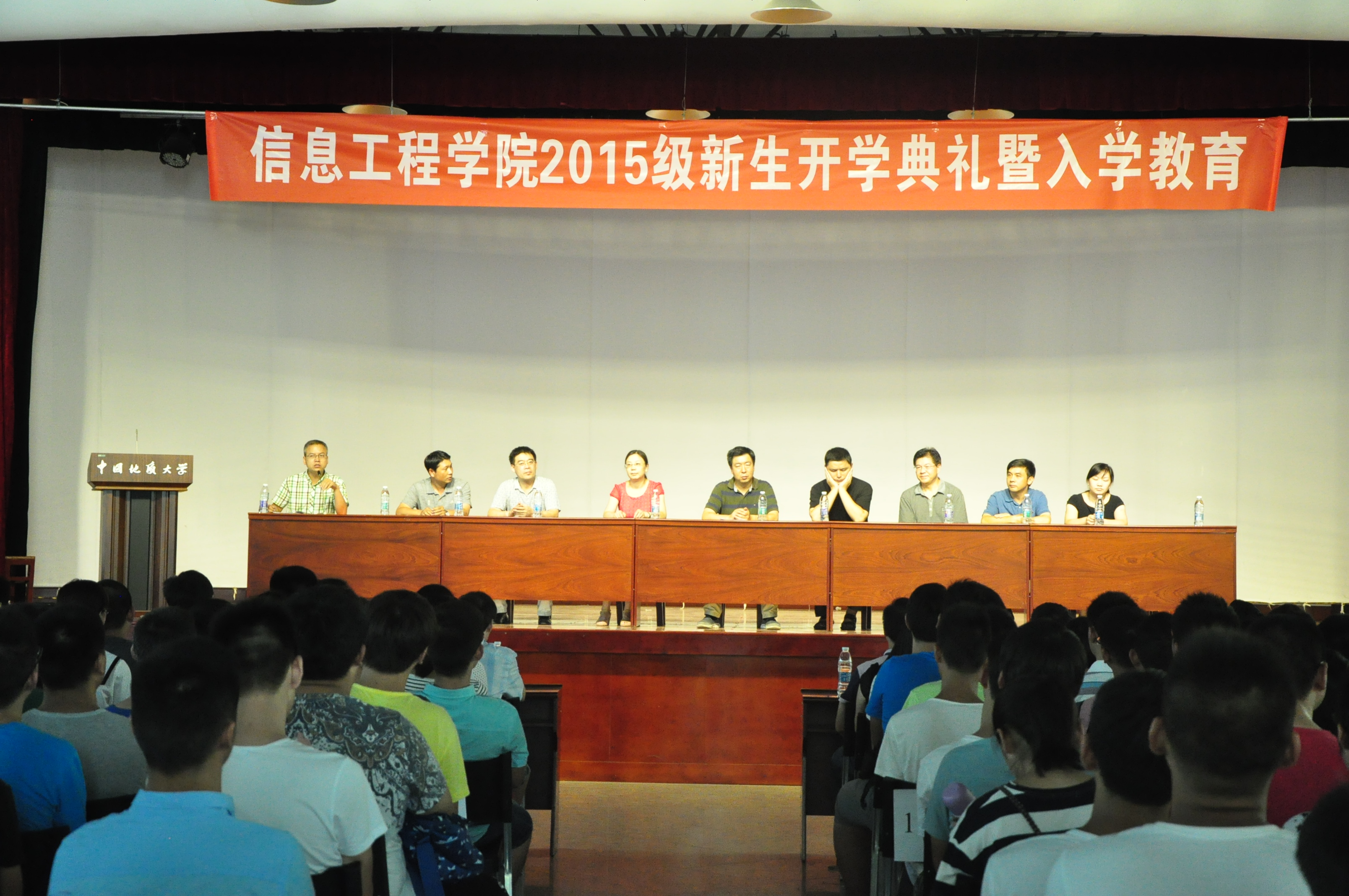 9月10日下午2:30,信息工程学院在大学生活动中心二楼举行了2015级新生开学典礼暨入学教育活动。信工学院院长谢忠、党委书记黄菊、副院长罗忠文、胡友健、刘修国、院党委副书记许德华、各系主任和学院部分教师以及2015级全体新生参加。此次活动分为两部分:新生开学典礼和新生入学教育。