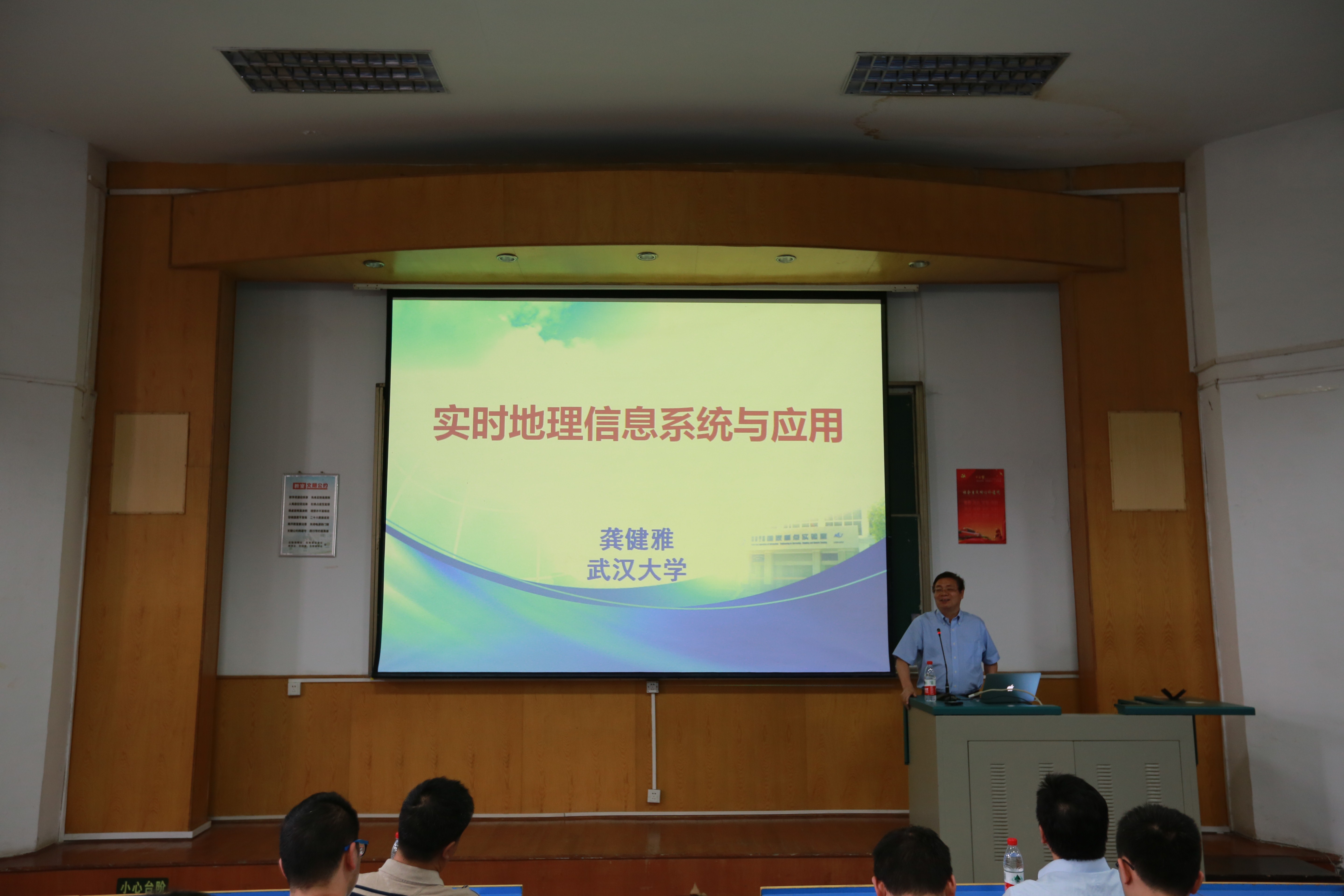 学生做题为“实时地理信息系统与应用”的学术报告。信息工程学院院长谢忠、副院长刘修国、党委副书记许德华和学院师生共同聆听了此次报告。