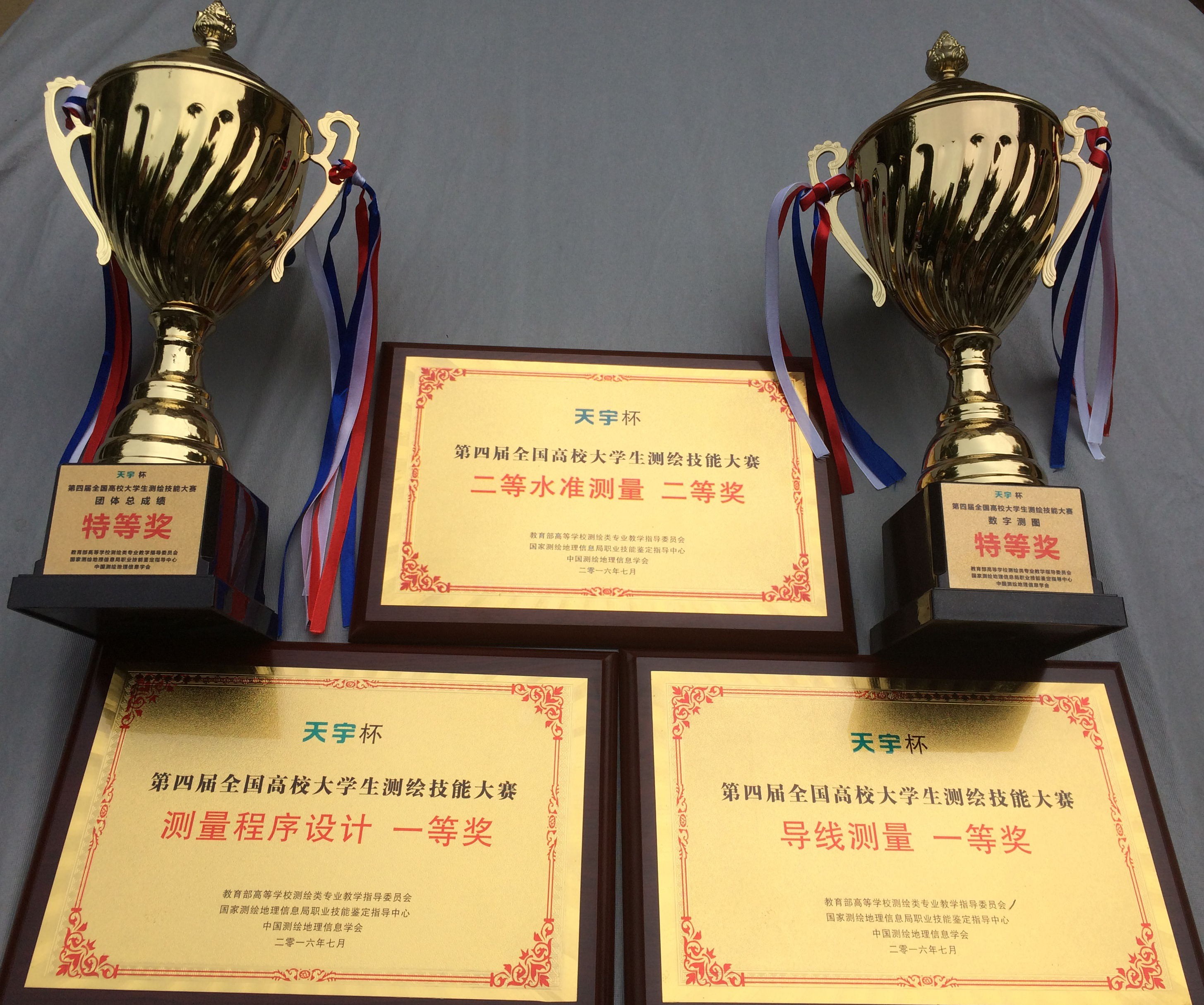 选派信工学院2013级测绘专业悦连哲、赵镇、吴辉、胡晋文、曹骞、马迎浩6名同学,在测绘系主任陈刚教授和潘雄、陈于、赖祖龙、岳迎春老师的悉心指导下,经过三天激烈的角逐,获得了数字测图特等奖、测量程序设计一等奖、导线测量一等奖、水准测量二等奖并以全国第四名的总成绩获得了团体总成绩特等奖的好成绩。