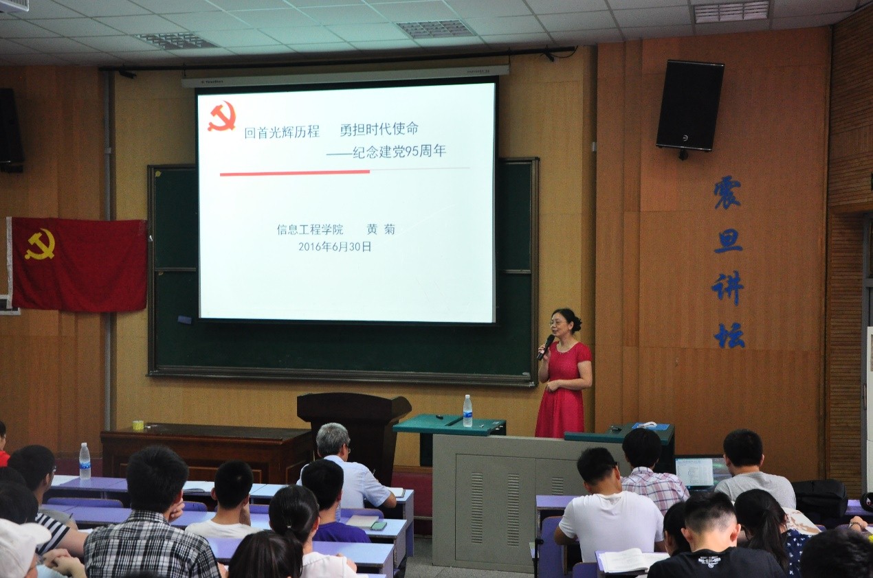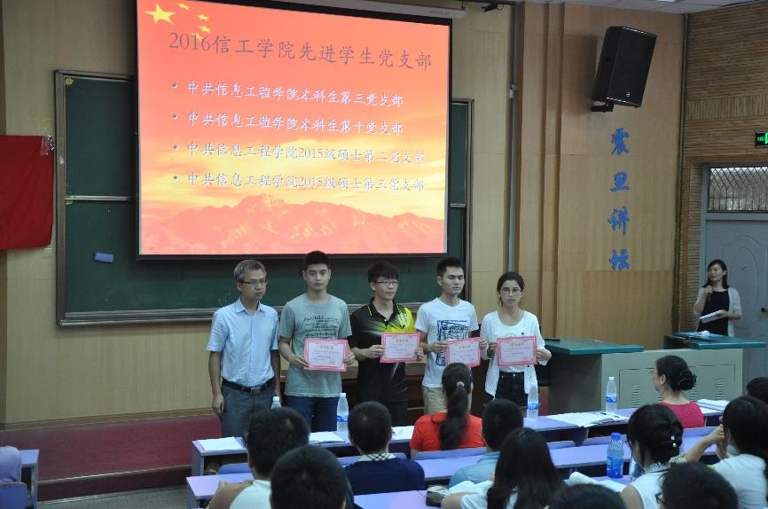 党委根据中国地质大学(武汉)《关于评选表彰先进本科生党支部和优秀本科生共产党员暨2015-2016年度“党徽照我行——支部引领工程”项目结题评选通知》及其他相关文件要求、结合学院实际情况,开展了此次“七一”表彰暨全体学生党员大会。 大会由信息工程学院学生党建办公室主任李雨竹老师主持,信息工程学院党委书记黄菊、党委副书记许德华、团委书记武彦斌、2013级辅导员王渊、2014级辅导员宋超以及信工学院全体学生党员参加。