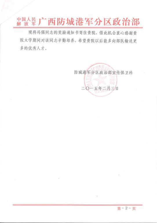 于二〇一五年二月收到中国人民解放军广西防城港军分区政治部宣传保卫科寄来的冯强同志奖励通知书和冯强同志的情况说明。冯强同志现为中国人民解放军广西防城港军分区政治部宣传保卫科宣传干事,原为中国地质大学(武汉)信息工程学院2004级地理信息系统专业114041班学生,陕西宝鸡人,该同志自2008年毕业参军入伍后,分配至广西边防部队工作,历任排长、副指导员、团宣传干事,现任广西防城港军分区政治部宣保科干事。