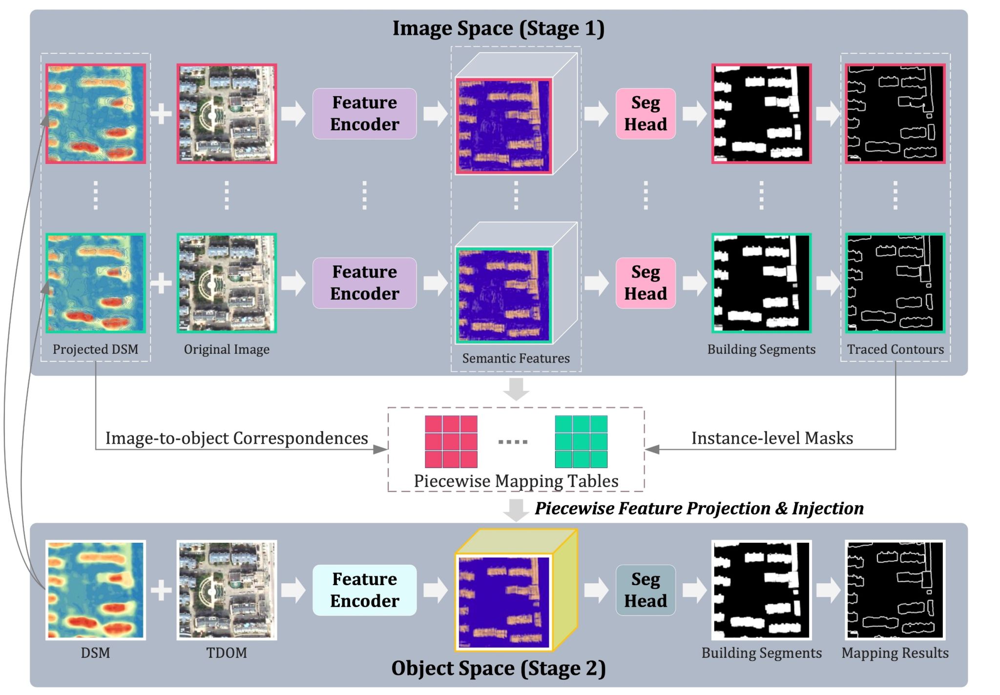 建筑物轮廓提取与制图是摄影测量与遥感领域的经典问题。尽管深度学习方法的深入应用显著提升了遥感影像建筑物提取的精度水平,自动化的高精度制图当前仍面临较大挑战。本研究重点着眼于将目前主流建筑物分割学习框架从单一物方空间拓展至“多视像方与物方联动的双重空间”,从而挖掘利用航空摄影测量工程中固有的多视冗余观测信息,以更好地促进建筑物分割任务中的特征融合。研究提出了名为Multiview Mapper(MVMapper)的端对端学习框架,在两组多视航空影像数据集上取得了明显的精度提升效果,揭示了多视融合方案在遥感影像建筑物制图领域的应用潜力。