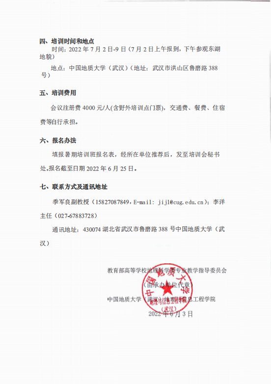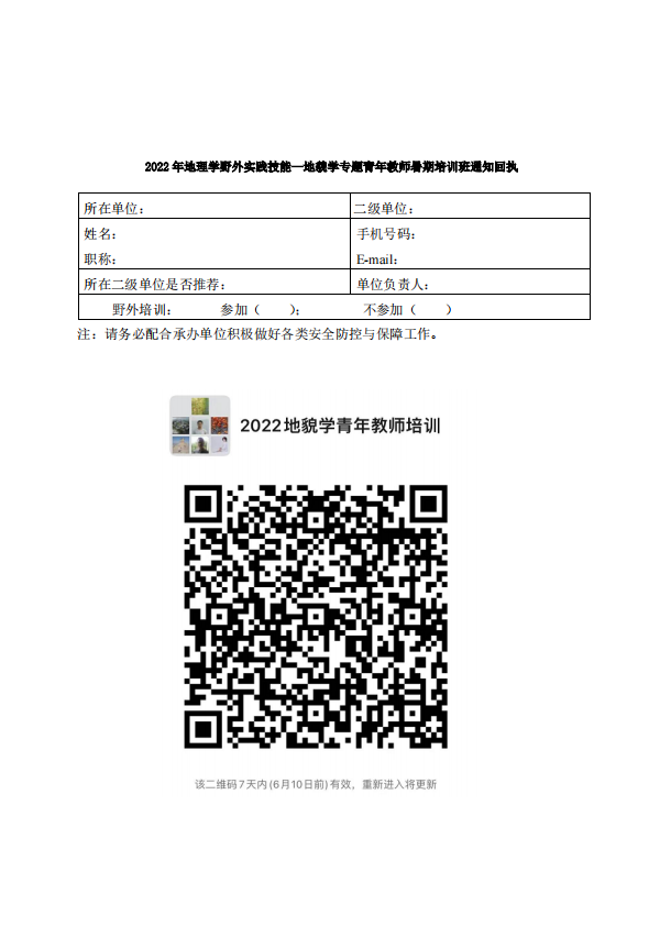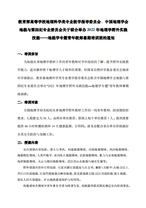 教育部高等学校地理科学类专业教学指导委员会、中国地理学会地貌与第四纪专业委员会关于联合举办2022年地理学野外实践技能——地貌学专题青年教师暑期培训班的通知
