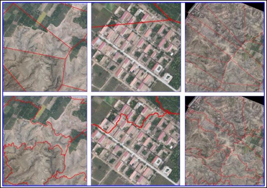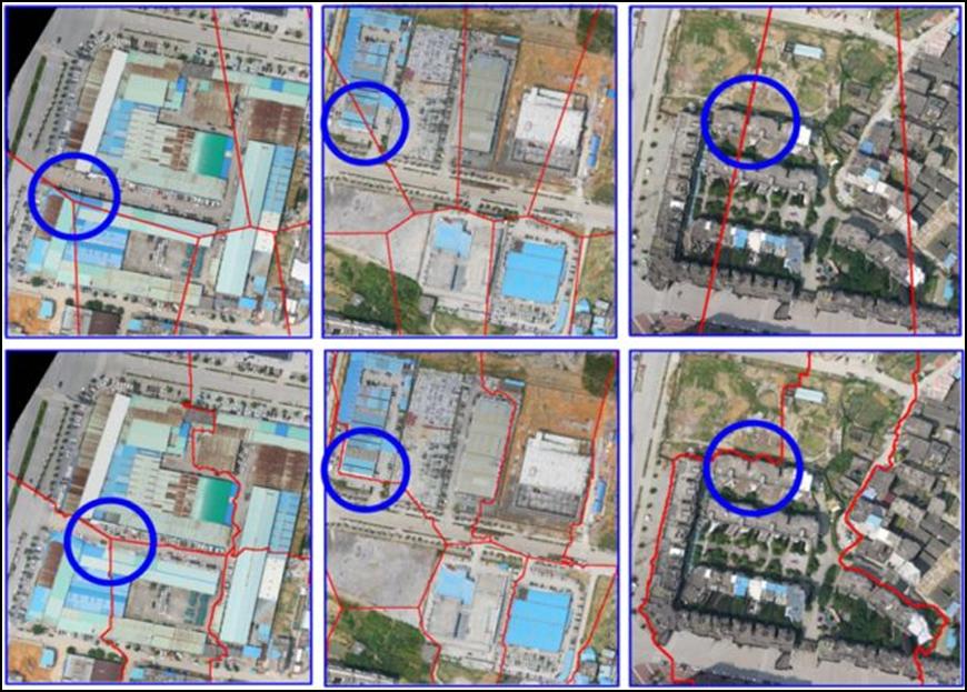 图2 第2组数据的初始镶嵌线以及用本文方法优化后的镶嵌线在细节处的对比图。上面三张图片为初始镶嵌线,下面三张图为对应的优化后的镶嵌线