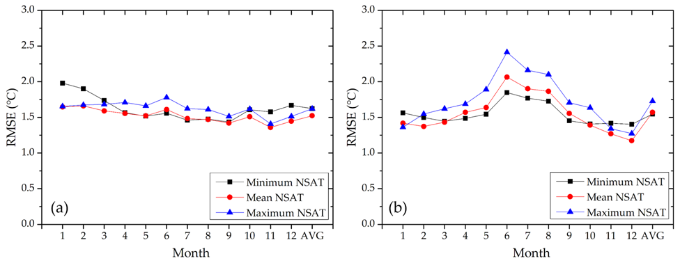 图3(a)基于地理加权回归模型的不同近地表气温月度统计值估算精度;(b)基于克里金插值模型的不同近地表气温月度统计值估算精度;MinimumNSAT表示月度最低近地表气温,MeanNSAT表示月度平均近地表气温,MaximumNSAT表示月度最大近地表气温。