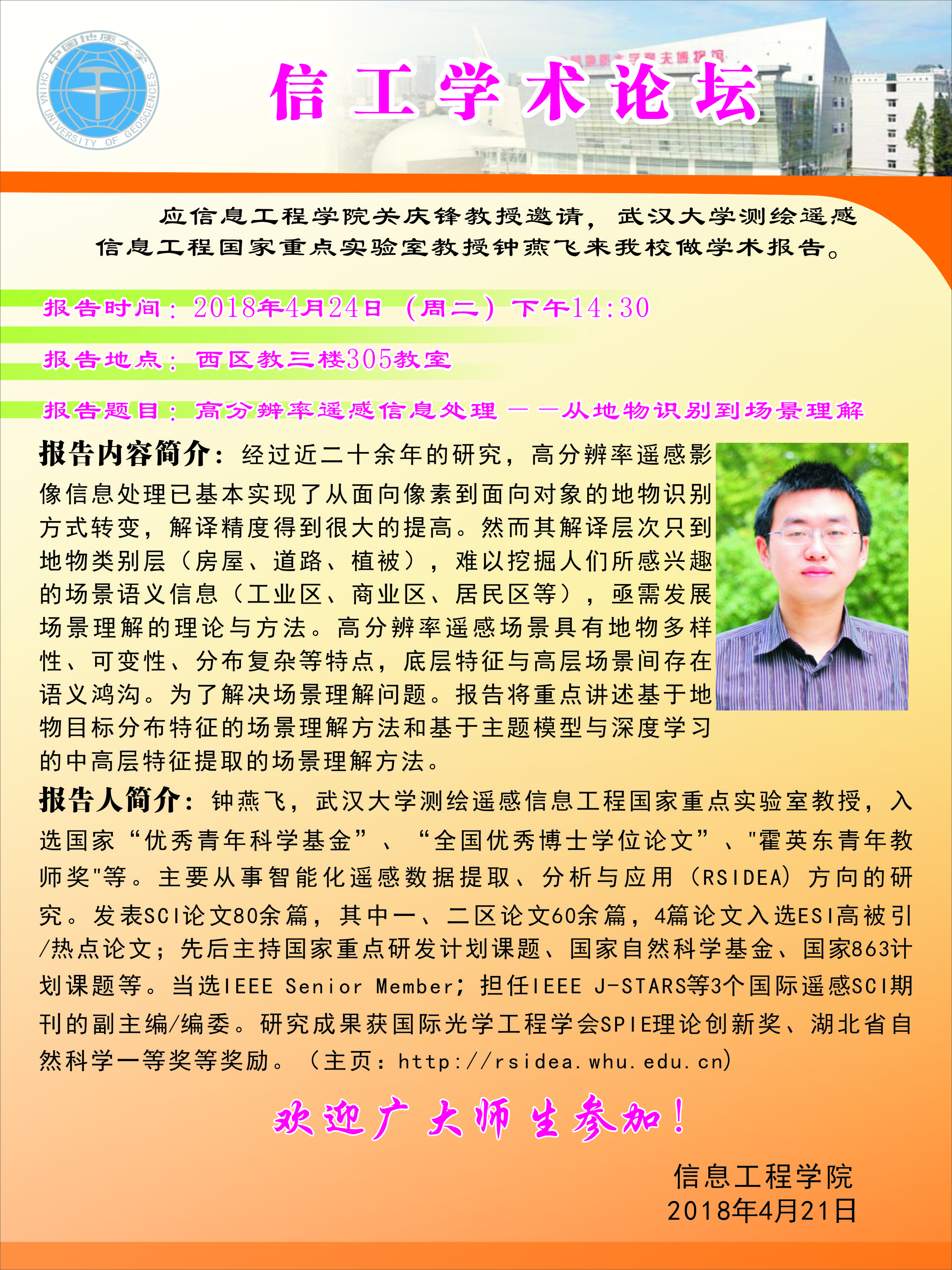 信工学术论坛第112期:武汉大学钟燕飞教授