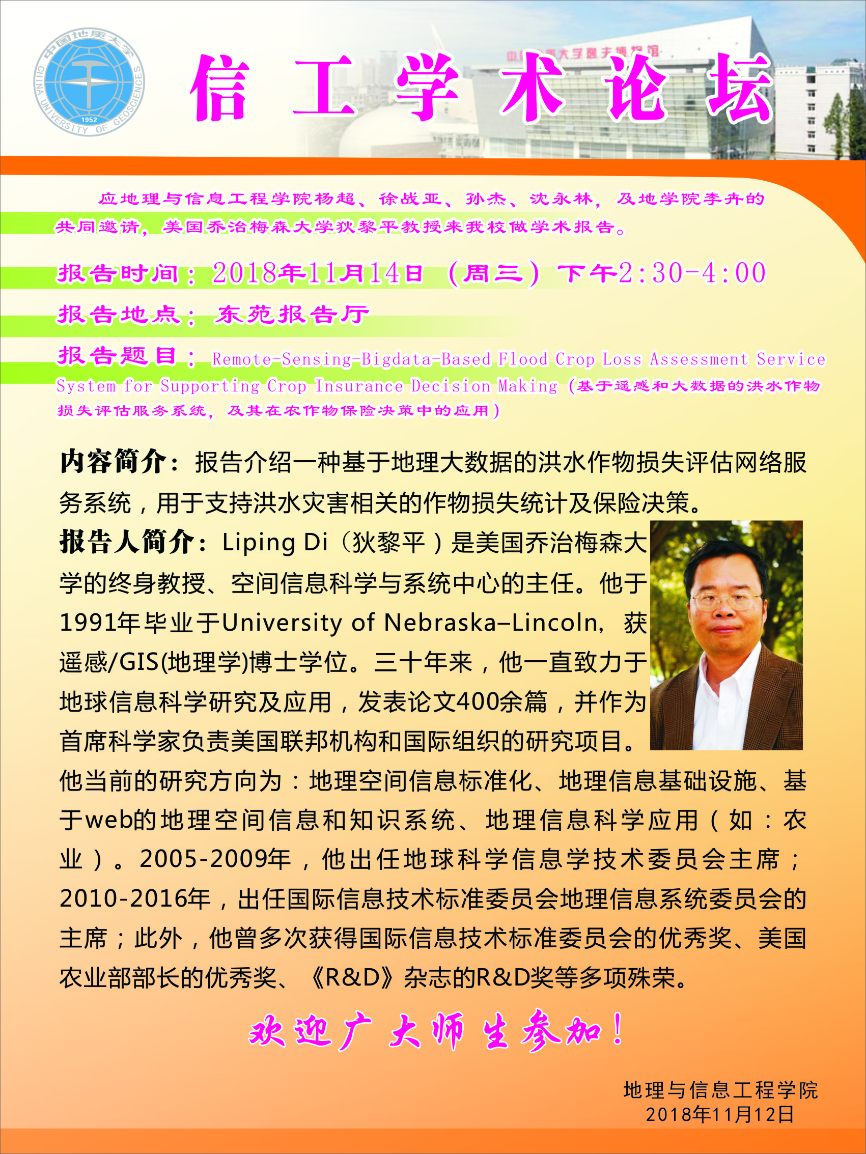 信工学术论坛第124期:美国乔治梅森大学Liping Di(狄黎平)教授