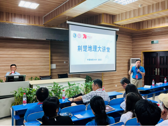 季军良副教授主持。秭归县委党校三级教授郑承志教授应邀做了题为“传承屈原文化 培育地理传人”的报告。郑承志教授为实习师生详细介绍了屈原的姓氏文化,《离骚》、《天问》、《橘颂》等文学作品、廉洁思想和爱国主义精神、以及屈原文化与地理学之间的关系。实习师生围绕如何充分发挥历史文化的政治、经济效益,如何深化课程思政和文化与地理的融合等内容展开讨论。
