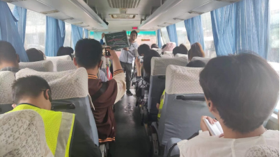 在去石花洞的大巴车上给学生讲课