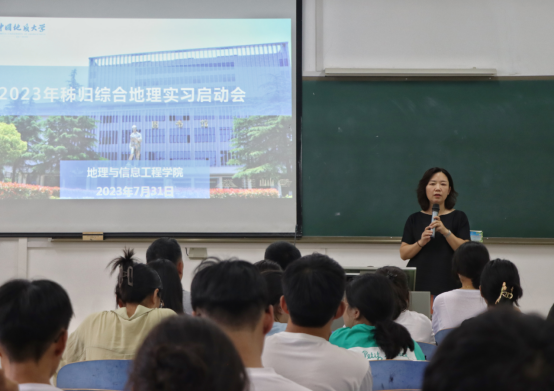 地理科学专业118211班、118212班及指导老师共51名师生组成的秭归综合地理实习队到达中国地质大学(武汉)秭归产学研基地并召开实习启动会,拉开了为期四周的2023年秭归综合地理实习帷幕。会议由实习队长侯林春主持,学院党委书记孙莉、副院长宋小青、带队教师孙嘉、辅导员陈涛,基地副站长李桢以及实习队全体同学参加会议。