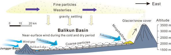 Conceptual model of the aeolian processes and formation of Mingsha Shan in the eastern Balikun Basin. More fine particles were transported by the westerlies during the wet periods, with weak near-surface winds settling the sediments across the Balikun Basin. Conversely, more coarse particles were transported by strong near-surface winds during the cold and dry periods, with deposition across the basin. The only low-elevation gap in the northwest strongly enhanced the near-surface wind intensity when the wind currents entered the Balikun Basin. The dashed arrows show the near-surface transportation of well-sorted coarse particles, and the gray arrow shows the lifted fine particles. More geomorphological details of the Balikun Basin refer to Figure 1B.