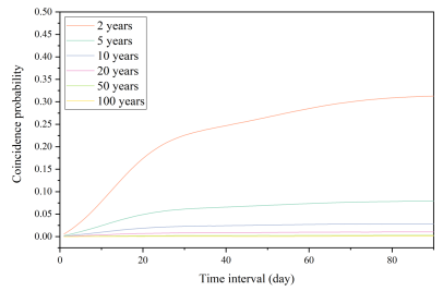 构造三维copula进行一致性概率分析:主站的降水极值,从站的极值和两个站极值出现时间的间隔。GEV模拟量级的边际分布,极端降雨发生时间的间隔采用混合的von Mises分布拟合,最大似然估计(MLE)方法进行copula参数估计。图3显示了6和23站点组合的降雨一致性概率与时间间隔的关系。时间间隔从1天增加到90天,一致性概率持续增加,且两个站点之间的极端降雨主要发生在30天内。固定30天时间间隔,33种气象站组合中,具有最高概率的三个测站组合为6和23、2和30以及7和25。具有最低概率的三个测站组合为9和12、11和5以及32和24。结果表明时间间隔是研究两地极端降雨联合风险以及水利规划设计时要考虑的重要问题。