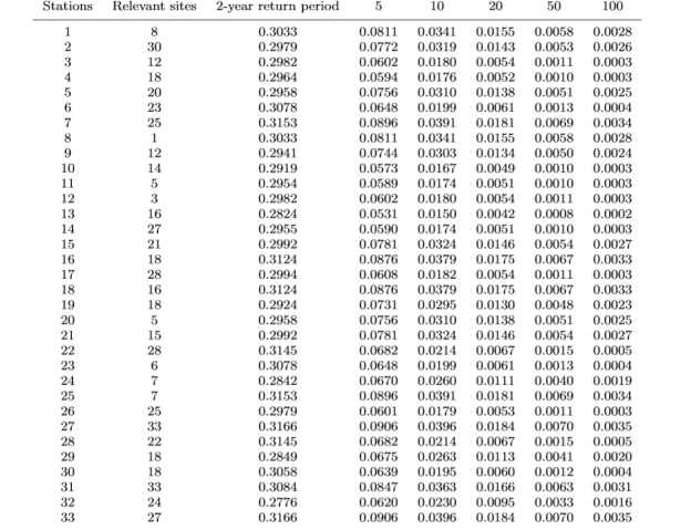 依次选择33个气象站作为主站,并选择对主站依赖性最强的气象站作为从站,分析发生2年一遇,5年一遇,10年一遇,20年一遇,50年一遇,100年一遇降雨的超越概率。结果在表1中列出。发现不同站点组合的极端降水超越概率接近,具有最高超越概率的站点组合为27和33,其次是25和7。