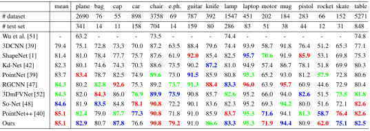 与发表在CVPR 2019的论文在ShapeNet数据集上的分割定量比较结果如表2所示,其定性比较结果如图1所示。