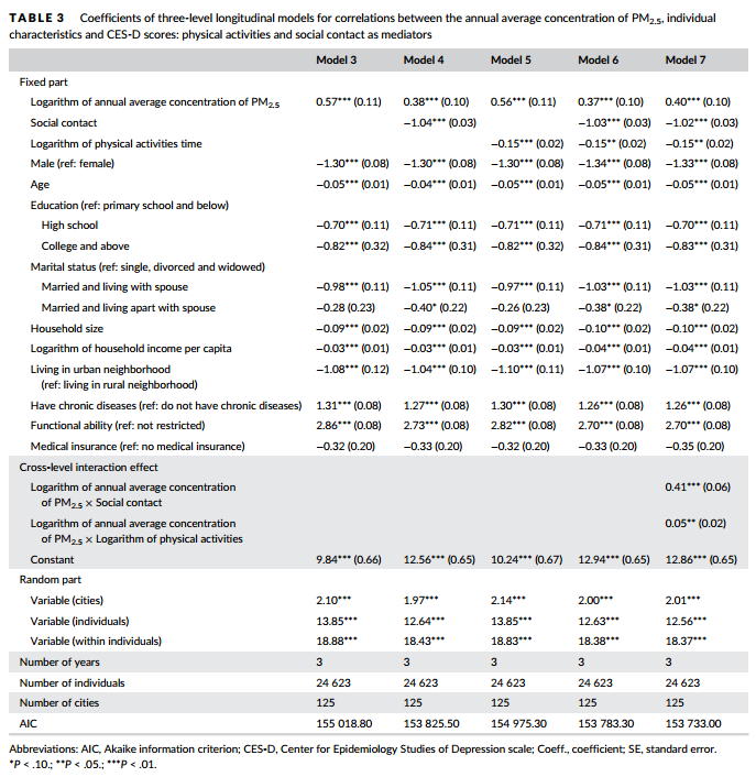 结论:因此,暴露于PM2.5下的中国老年人的抑郁症会因为体育活动和社交接触的减少而加重。另外体育活动和社交接触的积极作用会随着PM2.5浓度增大而降低。(译:董泽楷)