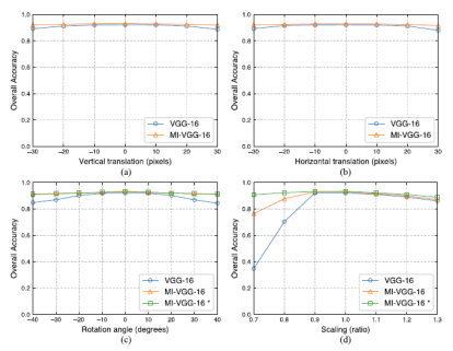 算法在平移、旋转,尤其是缩放变换中表现出了鲁棒性,感受野可随目标尺度变化而自适应缩放。在UCM、AID和NWPU数据集中,以网络参数数量减少约1个数量级的情况下,比传统网络模型取得了更高的分类精度。