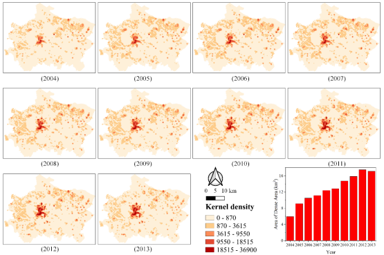 图3 常熟市2004-2013年空置住宅核密度分布