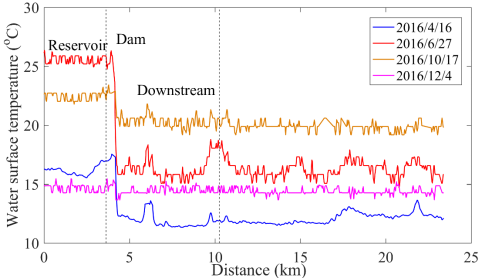 河流水温是河流的重要物理指标之一,对河流的物理、化学以及生物过程产生显著影响。大坝蓄水形成的水库使得水深加大,由于不同层位的水体受到的太阳辐射不同,导致水库出现表层热,底层冷的水温垂直分层现象,大坝排放的深层低温水会对下游河流水温产生显著的冷却效应。本研究以丹江口大坝为研究对象,收集158景2002-2017年Landsat系列热红外遥感影像,利用辐射传输模型法定量反演大坝上下游水面温度,研究了16年来丹江口大坝对下游汉江河流水温的影响,分析了2013年大坝加高后的“热效应”,并讨论了河流水温变化的生态后果。