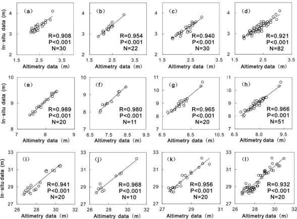 图1 (a-d)太湖的三种卫星测高水位数据(Envisat、ICESat-1和Cryosat-2)及其数据组合与实测水位数据的相关图;(e-h)巢湖的三种卫星测高水位数据(Envisat、ICESat-1和Cryosat-2)及其数据组合与实测水位数据的相关图;(i-l)南洞庭湖上的三种卫星测高水位数据(Envisat、ICESat-1和Cryosat-2)及其数据组合与实测水位数据的相关图(图中R为相关系数,P为显著性值,N为水位数量)