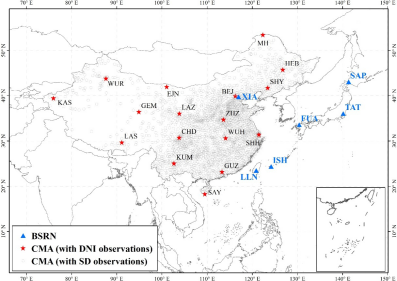 图1. 研究区地理位置及地表太阳法向直接辐射和气象要素观测站点分布情况