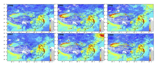 20世纪90年代初重霾事件随着中国东部地区人为排放的增加而增加(图5、6)。1990年华北地区AOD年平均约为0.5-0.6,分布较为均匀,极值较少,1995-1999年以来AOD高热点显著,在0.8-0.9之间。与1995-1999年AOD高热点突出的气溶胶空间分布不同,1990年华北气溶胶分布较为均匀,表明排放水平和来源不同。