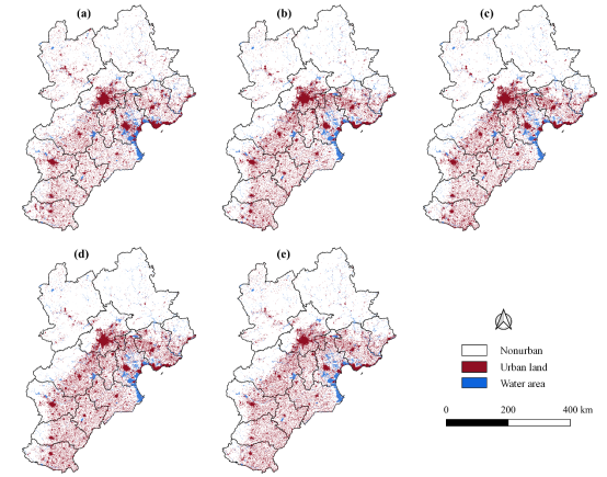 图3 2000-2015年京津冀城市群城市扩张模拟结果和真实情况对比:(a)2015年现状;(b)IGFM-RF-CA模拟结果;(c)GFM-RF-CA模拟结果;(d)GFM-LR-CA模拟结果;(e)RF-CA模型模拟结果