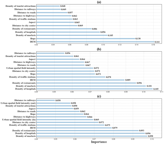 图7 驱动因素的重要性:(a)RF-CA;(b)GFM-RF-CA;(c)IGFM-RF-CA
