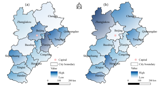 综上所述,本研究提出的IGFM-RF-CA模型在对比模型中具有最高的模拟精度。IGFM-RF-CA模型不仅可以提升整个京津冀地区的模拟精度,还可以提升大多数局部城市地区的模拟精度,特别是相对发达的城市(如:北京和天津);此外,信息流强度的加入,更有利于提高一些欠发达城市的模拟精度(如:张家口和承德)。经变量重要性分析,城市空间相互作用在14个驱动因素中排名第7,对城市群扩张具有比较重要的贡献。而且,信息流入强度对城市扩张的影响大于信息流出强度,因此,我们建议像张家口、承德这些欠发达城市可以提高在网络方面的影响力,以促进经济和城市的发展。