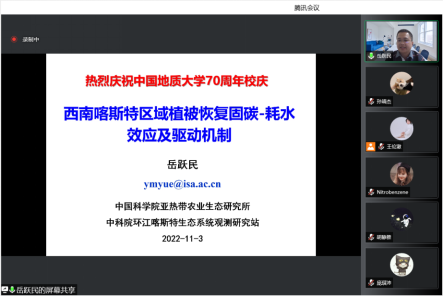 王伦澈教授邀请,中国科学院亚热带农业生态研究所岳跃民研究员于线上做了题为“西南喀斯特区域植被恢复固碳-耗水效应及其机制”的学术报告,受到师生的广泛欢迎。报告由王伦澈教授主持。