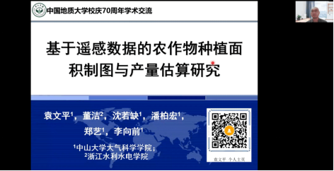 王伦澈、王绍强教授邀请,中山大学大气科学学院袁文平教授做客中国地质大学(武汉)第53期名家论坛暨校庆七十周年学术交流会,以线上形式作题为“基于遥感数据的农作物种植面积制图与产量估算研究”的学术报告,受到师生的广泛欢迎。报告由王伦澈教授主持,线上、线下与会人数共计逾300人。