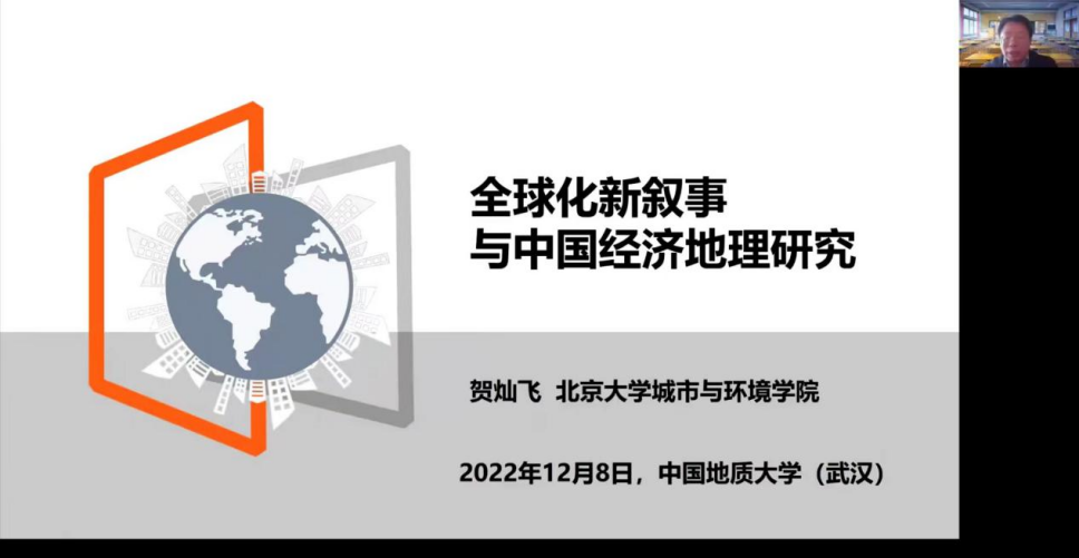 王绍强、王伦澈教授邀请,北京大学城市与环境学院院长贺灿飞教授做客中国地质大学(武汉)第111期名家论坛暨校庆七十周年学术交流会,以线上形式作题为“全球化叙事与中国经济地理研究”的学术报告,受到师生的广泛欢迎。报告由王绍强教授主持,线上、线下与会人数共计逾200人。
