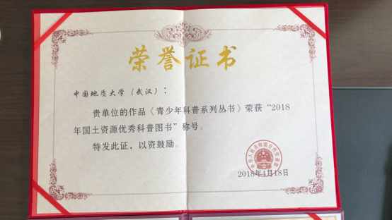 2018年4月22 日,在第49个世界地球日这天,自然资源部公布了“2018年国土资源优秀科普图书”名单,由中国地质大学刘福江副教授、博士主编,中国地质大学出版社出版的《青少年科普系列丛书》荣获国土资源优秀科普图书殊荣。