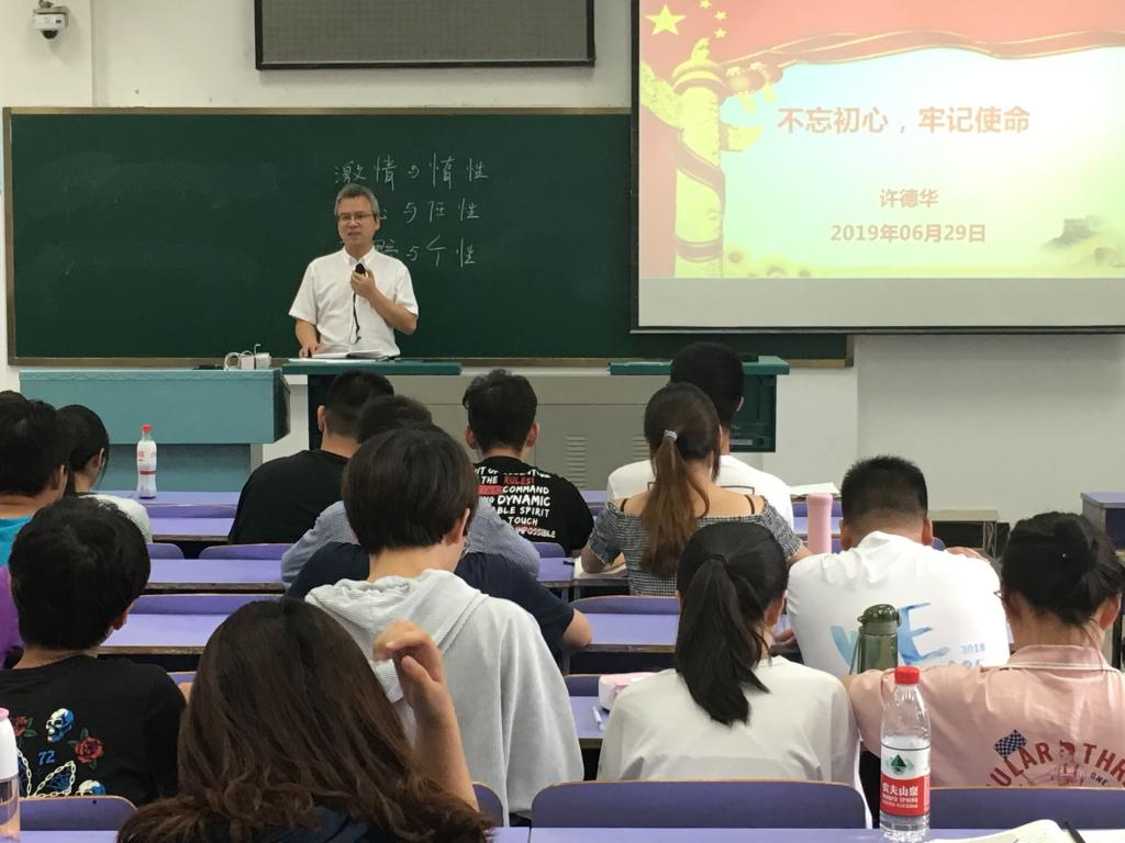 党委书记许德华老师与学院新发展的70余名预备党员及团委新任学生干部共聚一堂,分享了一场以“不忘初心、牢记使命”为主题的生动党课,党课于2019年6月29日下午3:00在教三301教室准时开讲。